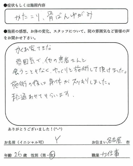 かくれ家てきな雰囲気で、他の患者さんと会うこともなく、ゆっくりと施術して頂けました。