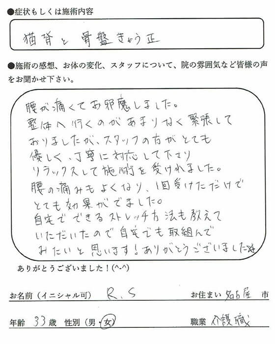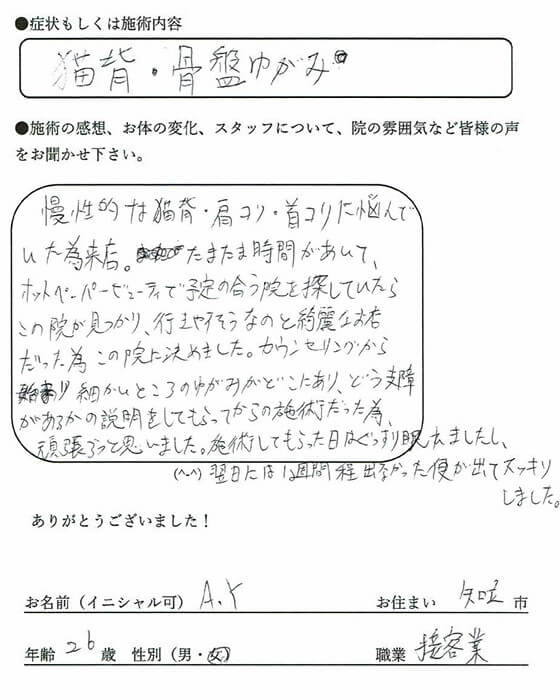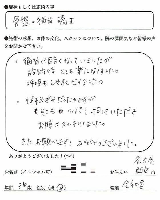 ・猫背が酷くなっていましたが施術後とても楽になりました。