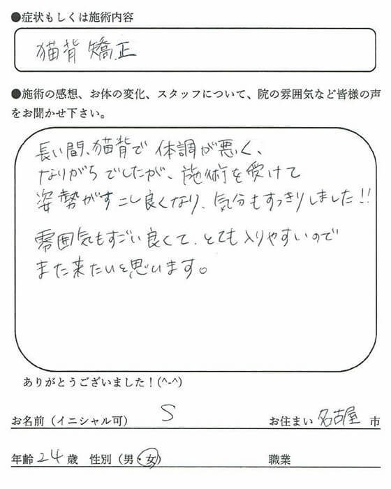施術を受けて姿勢がすこし良くなり、気分もすっきりしました!!